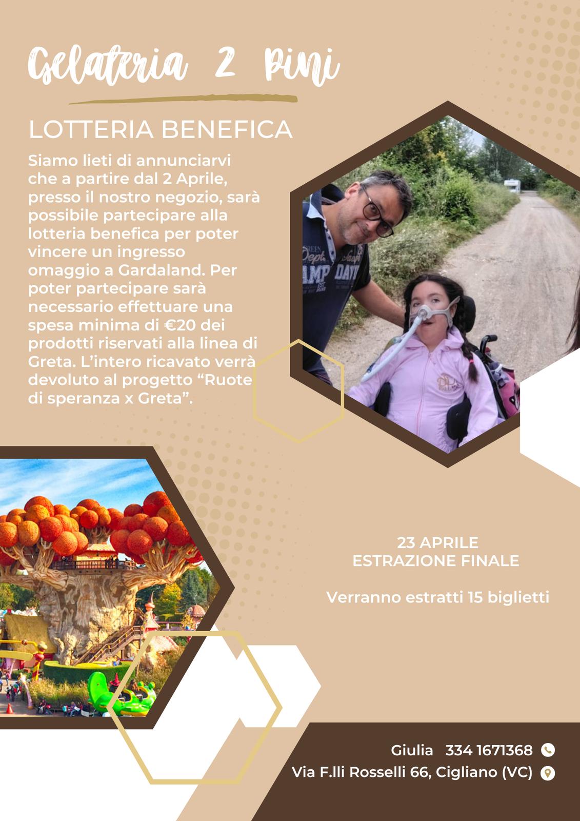 La Gelateria Due Pini che fin da subito ha deciso di scendere in campo per sostenere “Ruote di Speranza” per Greta ha creato una nuova bellissima iniziativa: una lotteria solidale!